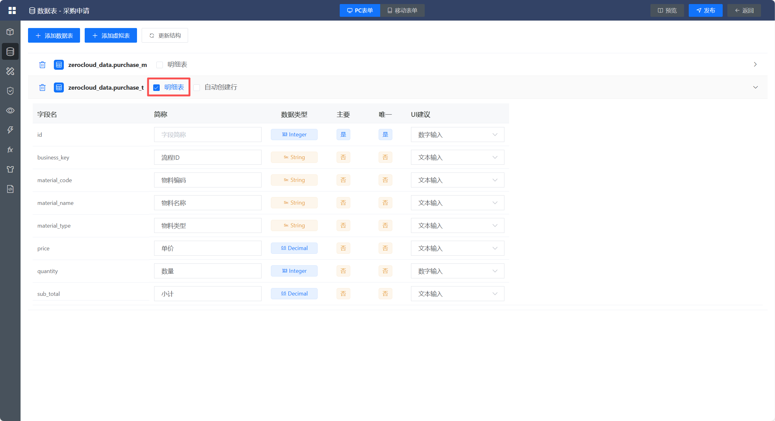 若添加的数据表中有明细表,需要勾选上明细表。同时也可以展开数据源查看包含的字段信息和对应的字段简称,字段简称可以自定义修改,注意,字段简称最好不要重复