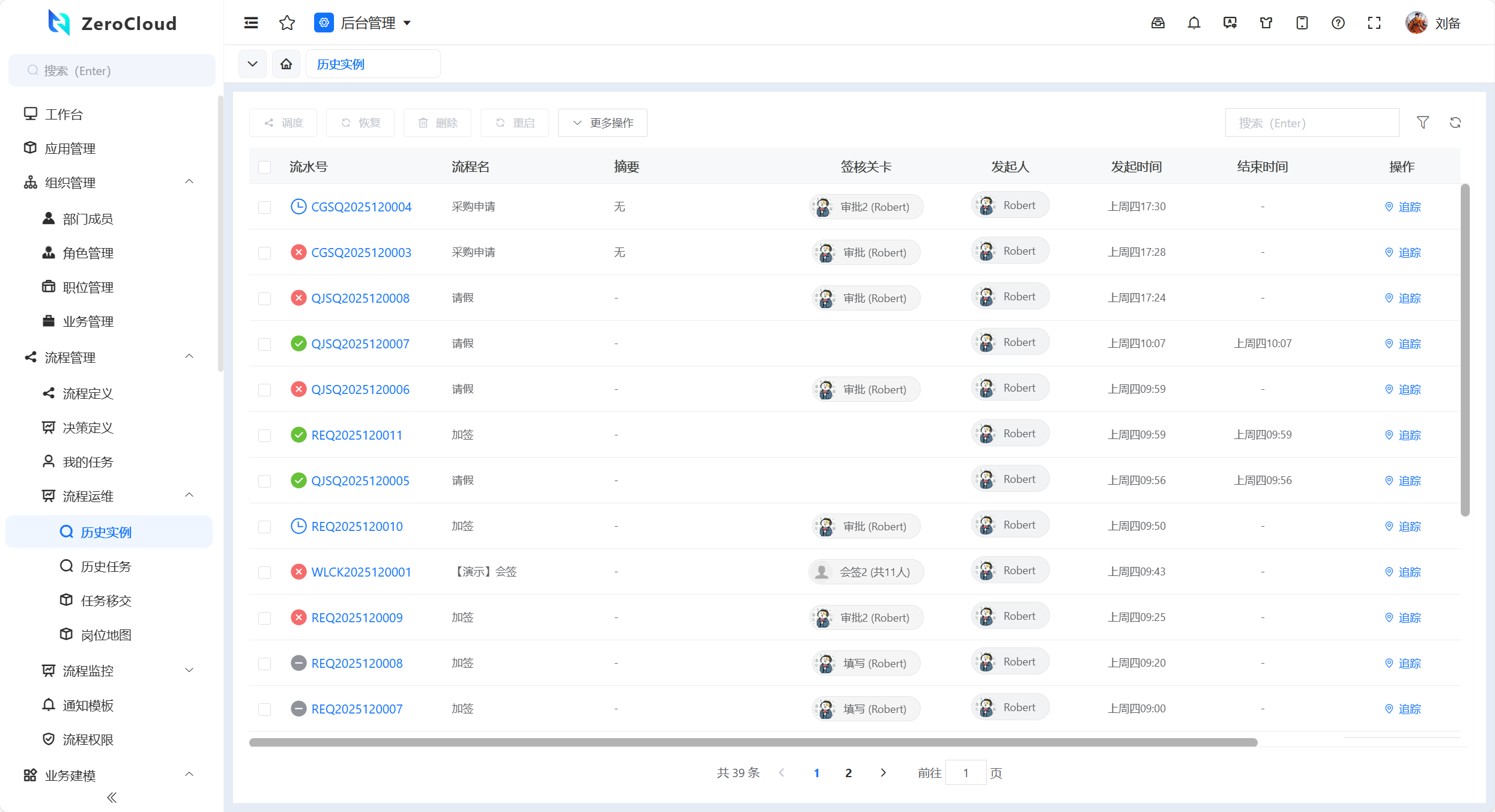在历史实例页面中,可以流程实例进行管理,例如调度、恢复、删除、重启和追踪等