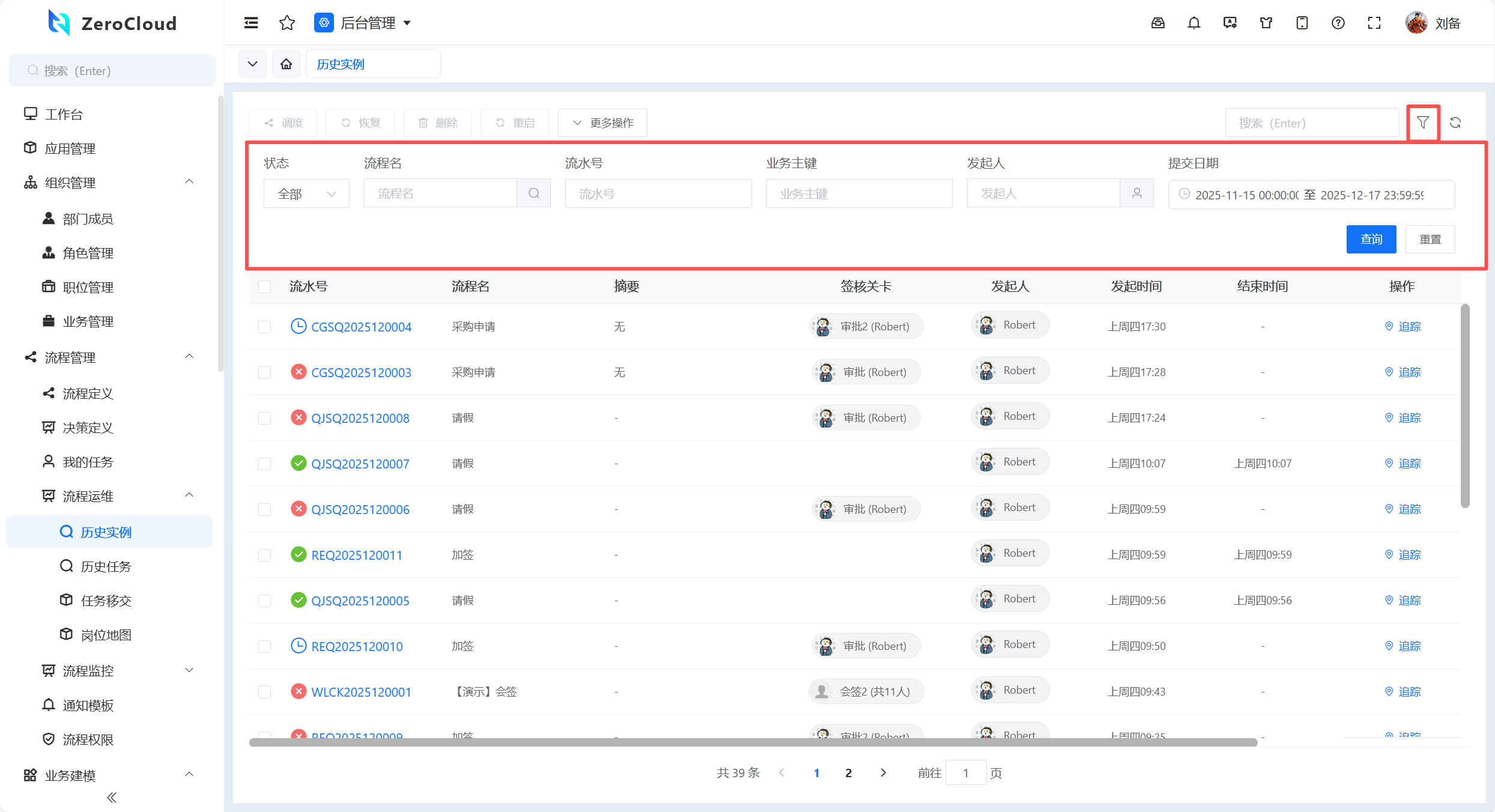 可以根据状态、流程名、流水号、业务主键、发起人和提交日期来进行搜索