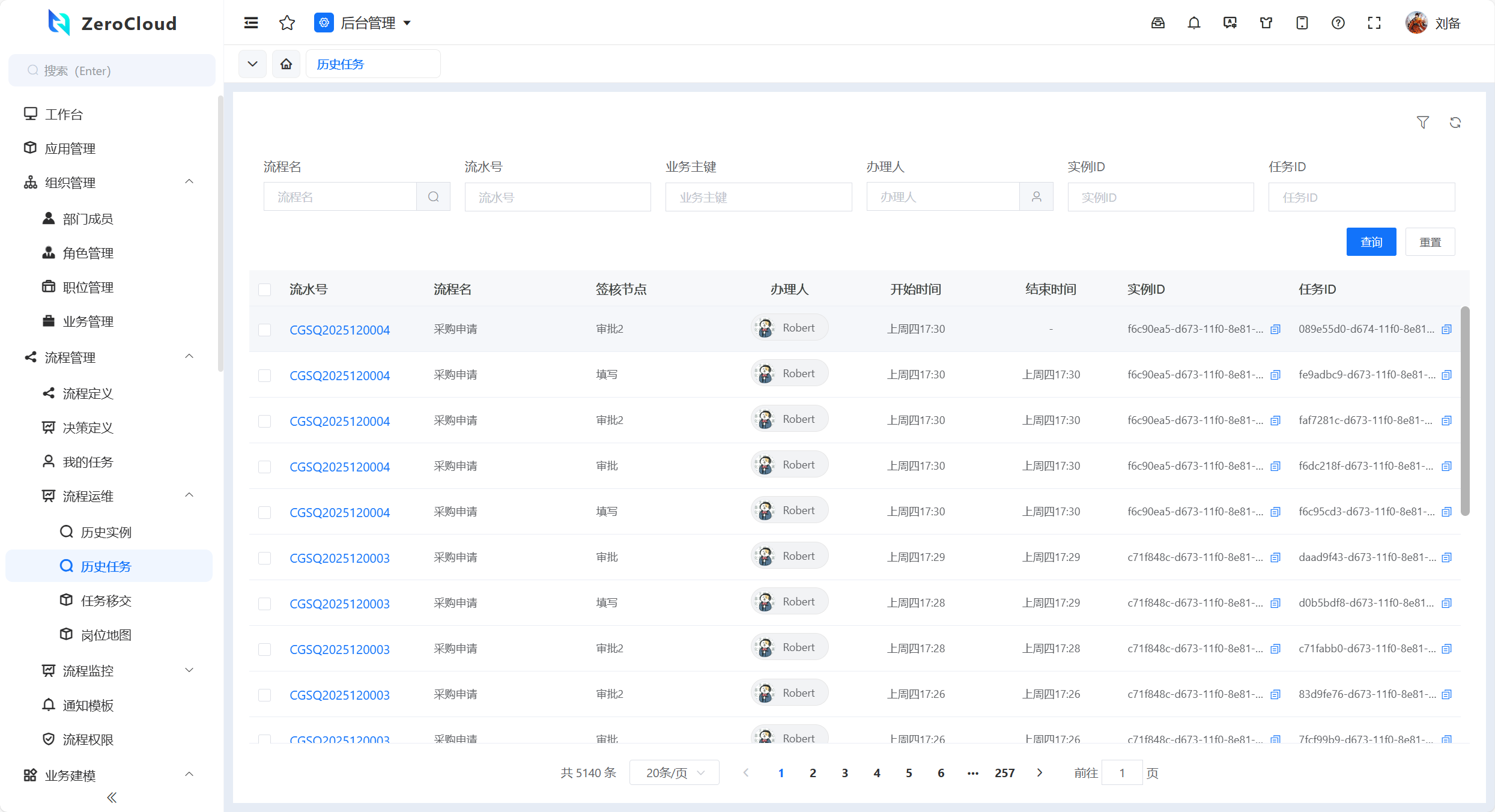 在历史任务页面,可以查看所有任务,可以根据流程名、流水号、业务主键、办理人、实例ID和任务ID进行精确搜索