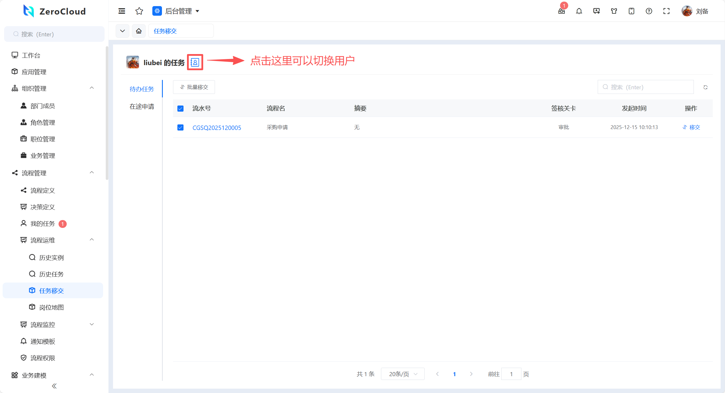 在任务移交页面,可以将用户的待办任务和在途申请移交给其他用户